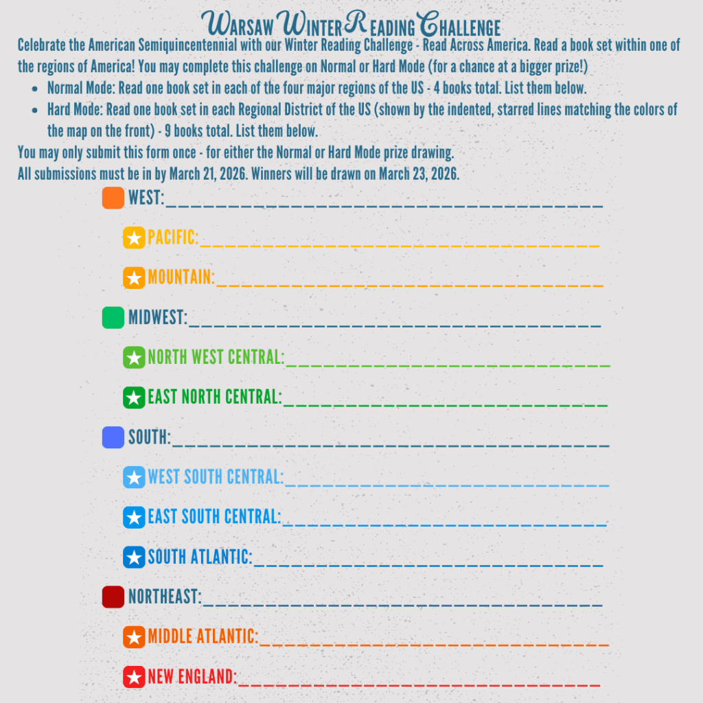 Celebrate the American Semiquincentennial with our winter reading challenge, Read Across America. Read a book set within each of the regions of America! You may complete this challenge on Normal or Hard Mode (for a chance at a bigger prize!)